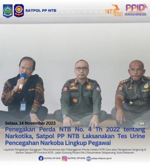 Sesuai dengan UU No. 35 Tahun 2009 tentang Narkotika dan, Inpres No. 2 Tahun 2020 tentang Rencana Aksi Nasional Pencegahan dan Pemberantasan Penyalahgunaan dan Peredaran Gelap Narkotika dan Prekursor Narkotika (P4GN), Satpol PP NTB melaksanakan kegiatan tersebut dimulai dari Kepala Satuan, Sekretatis, Pejabat Struktural, Pejabat Fungsional, dan staff.