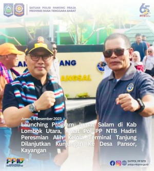 Satpol PP Provinsi NTB sebagai OPD yang memiliki tupoksi Pelindungan Masyarakat, menindaklanjuti Program unggulan Pemprov NTB, yaitu Jumat Salam (Jumpai Masyarakat Selesaikan Aneka Persoalan Masyarakat) pada seri ke-8 Kab Lombok Utara, dirangkaikan dengan serah terima hibah aset dari Pemprov NTB melalui Dishub NTB, berlokasi di Terminal Bangsal dan Terminal Tanjung, KLU, Jumat pagi (8/12).