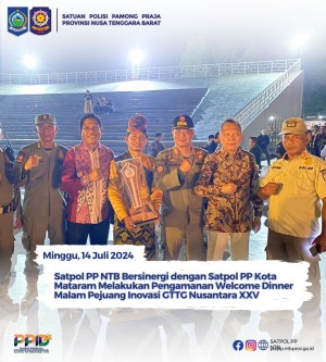 Halo sobat praja!! Satpol PP NTB dipimpin kabid tibum, Piter Umbuloli bersinergi dengan Satpol PP Kota Mataram dan Polresta Mataram melakukan pengamanan kegiatan Welcome Dinner Malam Pejuang Inovasi Gelar Teknologi Tepat Guna Nusantara Ke-25 di Teras Udayana Kota Mataram. Minggu malam, 14 Juli 2024.