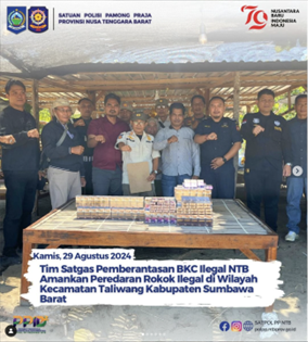 Menyasar Kecamatan Taliwang, Kabupaten Sumbawa Barat tim Satgas Pemberantasan BKC Ilegal NTB tim dipimpin oleh Kepala Bidang Penegakan Peraturan Perundang-Undangan Daerah (P2D), Muhammad Sujaan,S.Sos didampingi oleh Satpol PP Kabupaten Sumbawa Barat, berhasil mengamankan serta menertibkan sebanyak 6.060 Batang/303 bungkus Rokok Tanpa Cukai/Cukai Rusak/Cukai tidak sesuai, disertai dengan sosialisasi mengenai rokok ilegal secara langsung kepada para pedagang rokok setempat.