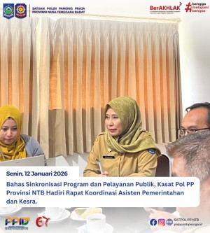 Kepala Satuan Polisi Pamong Praja Provinsi Nusa Tenggara Barat, Dra. Nunung Triningsih, M.M, hadiri Rapat Koordinasi lingkup Asisten Pemerintahan dan Kesejahteraan Rakyat (Kesra) pada Senin, 12 Januari 2026.